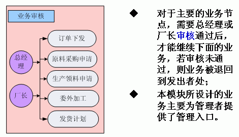 對(duì)于主要的業(yè)務(wù)節(jié)點(diǎn),需要總經(jīng)理或廠長(zhǎng)審核通過(guò)后,才能繼續(xù)下面的業(yè)務(wù),若審核未通過(guò),則業(yè)務(wù)被退回到發(fā)出者處;
